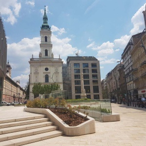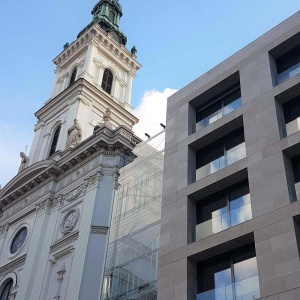 The designers of the recently completed new building solved the existing problem by using a natural stone facade with clean lines and simple geometric shapes. By opening the passage between the two buildings towards Servita Square, the masses of the church and the hotel were also more clearly separated.