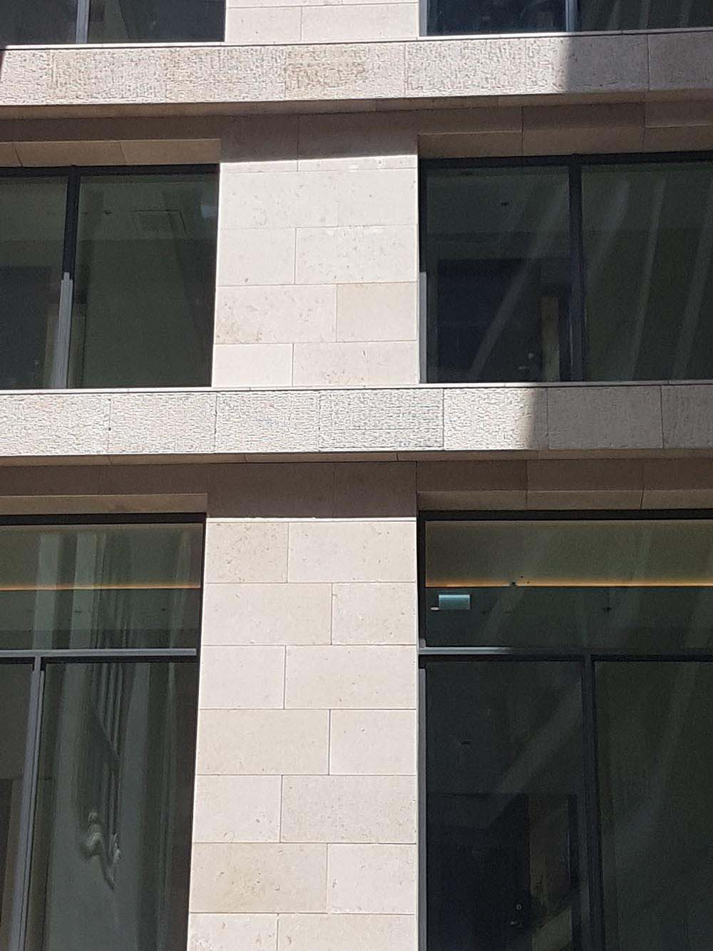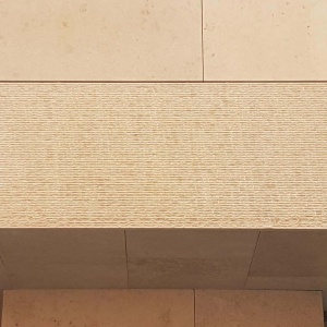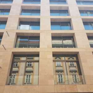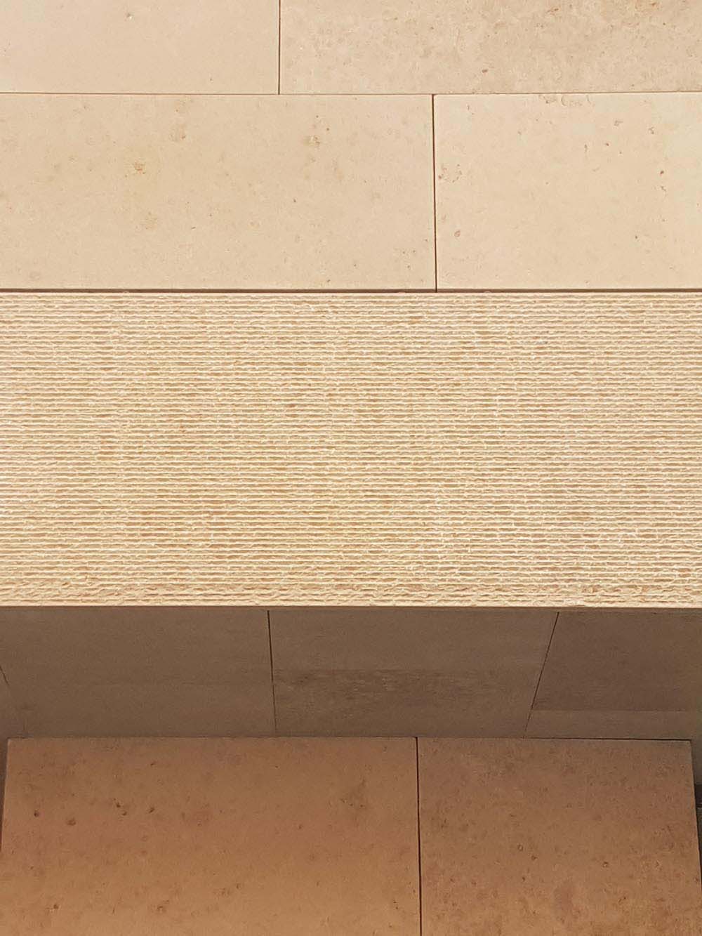 The facade cladding consists of 3 and 4 cm thick Jura limestone elements with sandblasted and striated surface. The material of the cladding comes from the limestone quarries around Solnhofen/Eichstätt, Germany.
