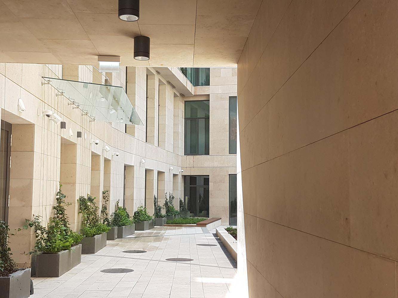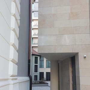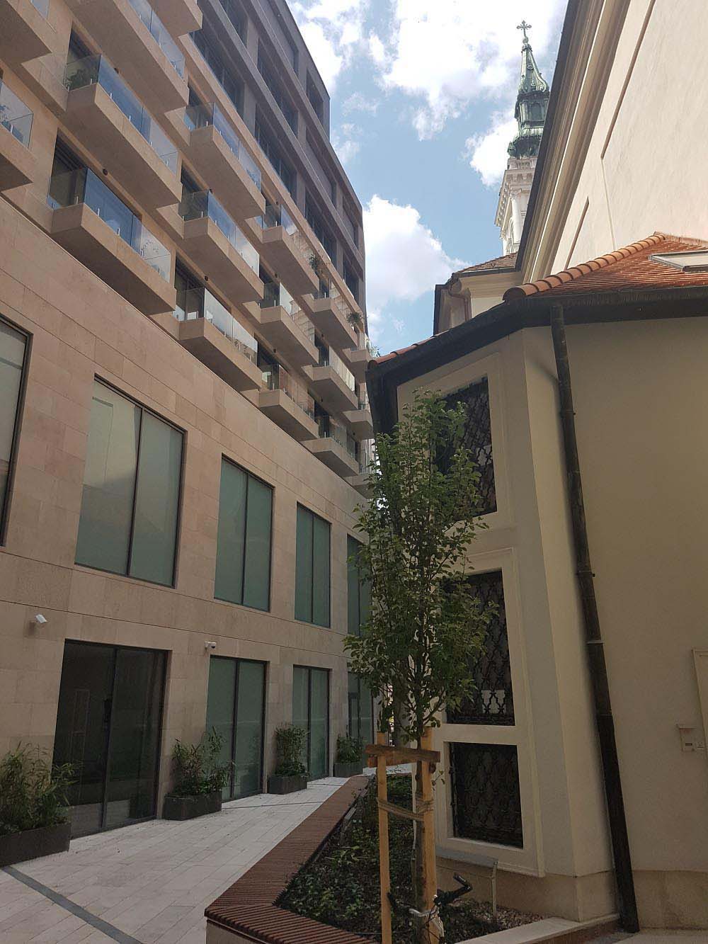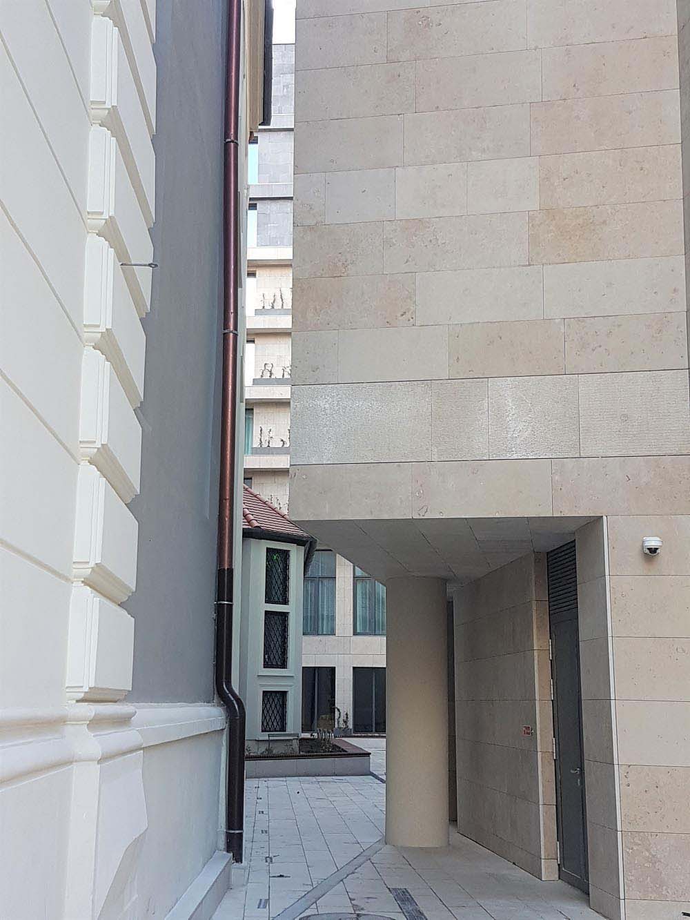 The inner passage between the building and the church will be open for pedestrian traffic as well. Walking through the narrow passage one can really feel the robust nature of the building, but the former dark passage has also become much friendlier and brighter thanks to the beige shade of the Jura limestone cladding.