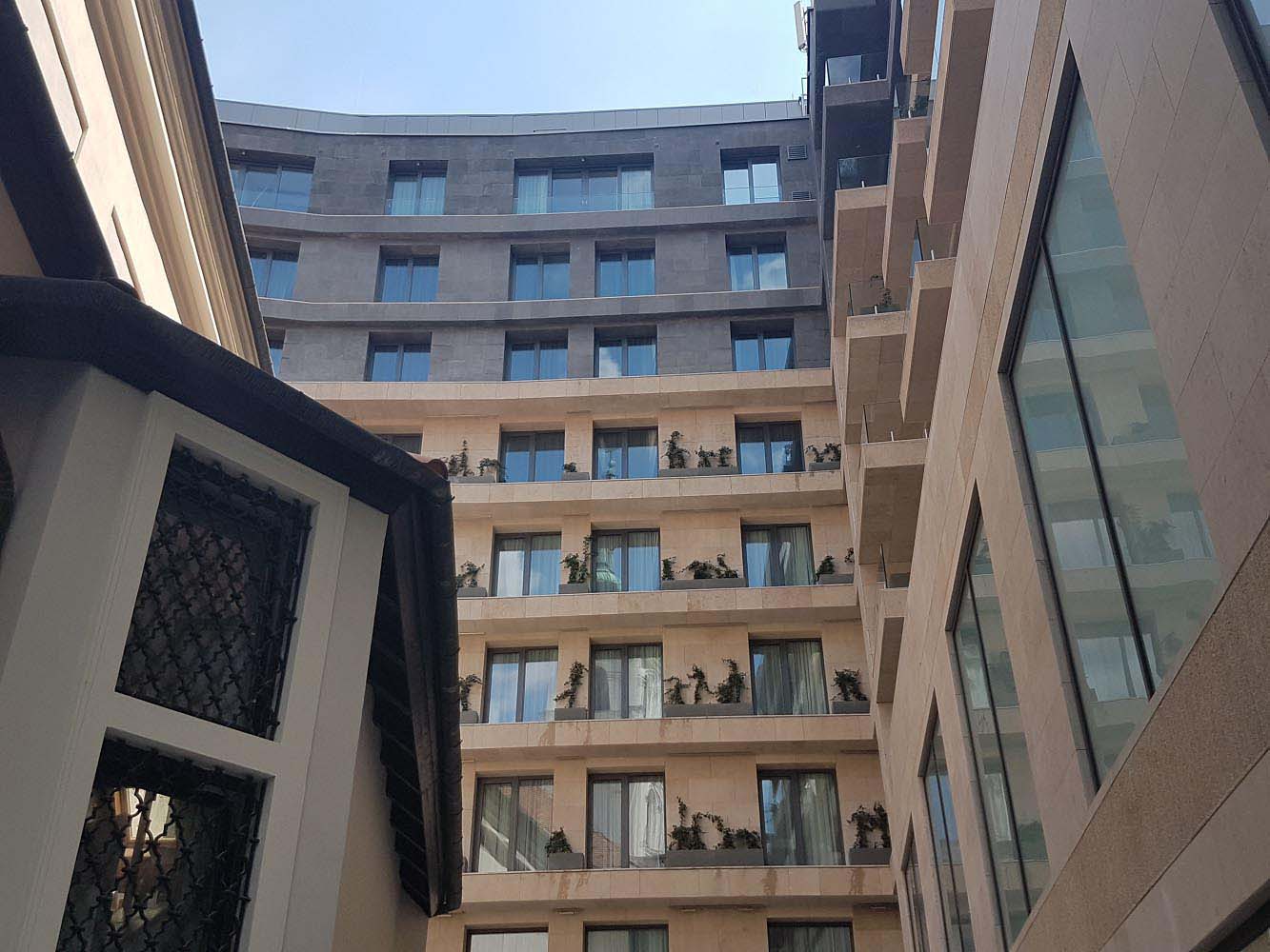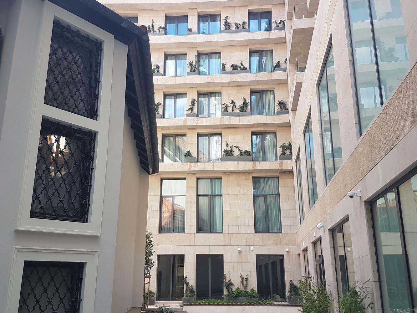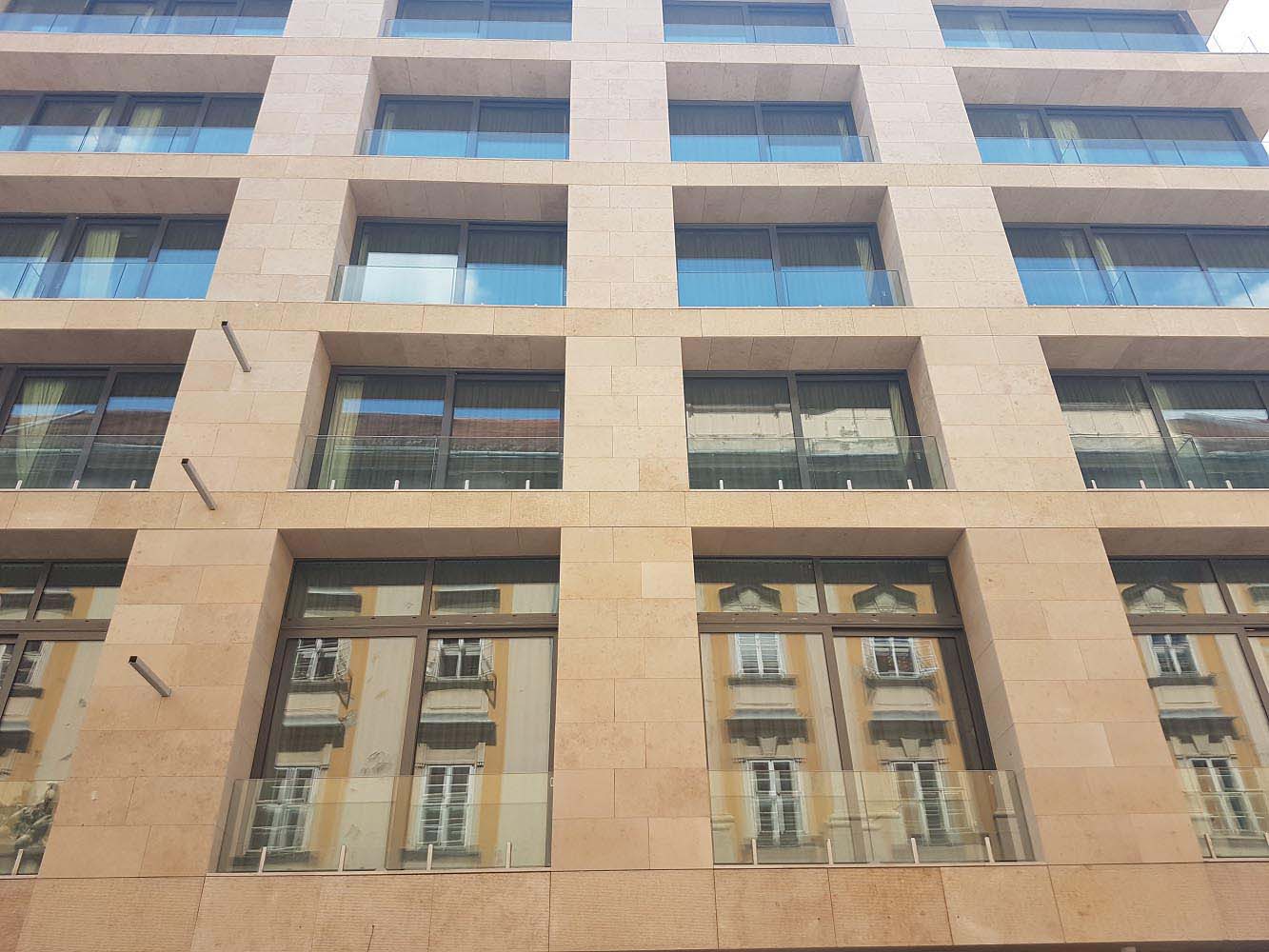 The beige-yellow limestone harmonizes well with the church’s light plastered facade and blends modestly into the eclectic look of Szervita Square, while giving the new high-prestige hotel an elegant look.