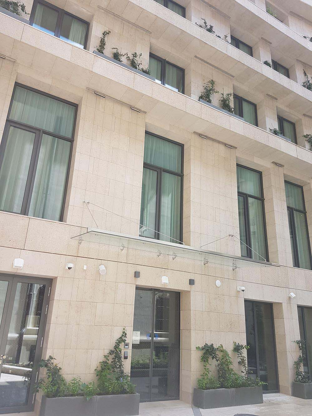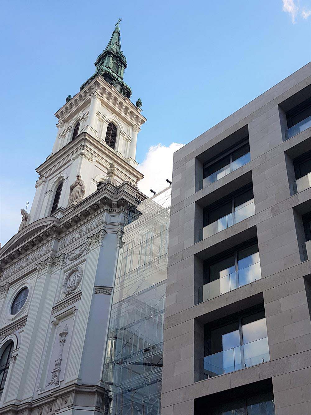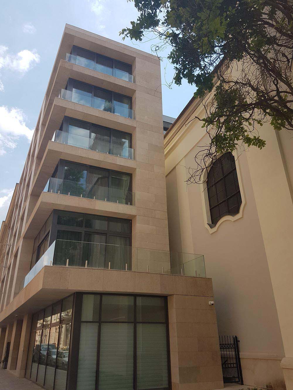 The beige-yellow limestone harmonizes well with the church’s light plastered facade and blends modestly into the eclectic look of Szervita Square, while giving the new high-prestige hotel an elegant look.