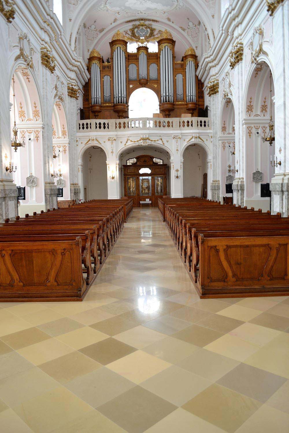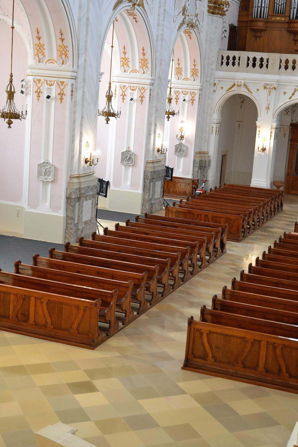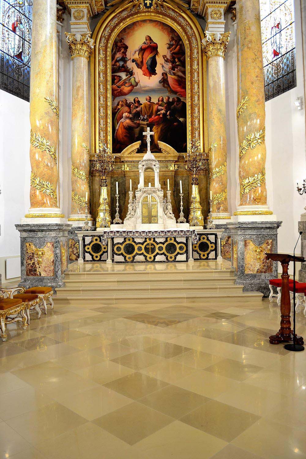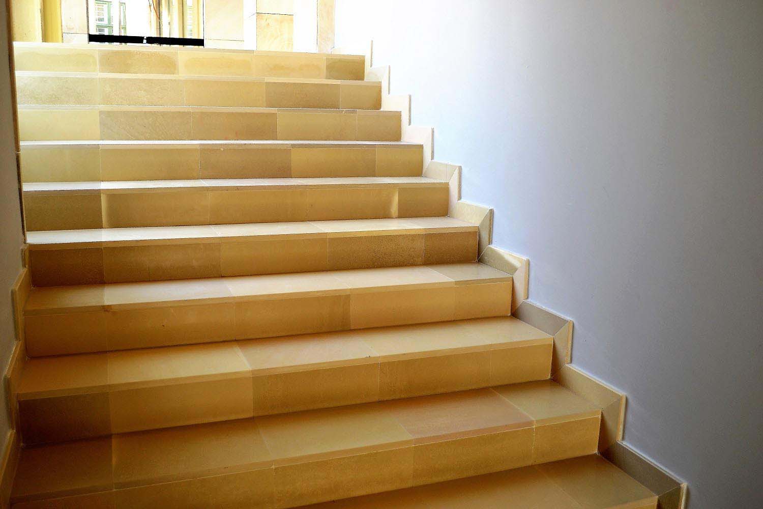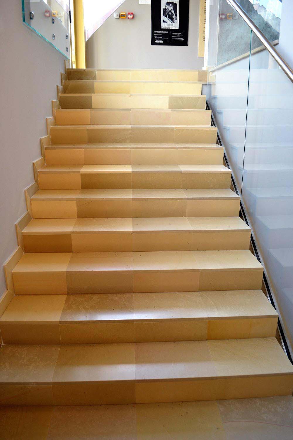 The interior spaces and stairs of the building were covered with slightly honed limestone tiles from Solnhofen, Germany. This limestone is known as Kelheim stone (based on the name of the former Danube loading port in Bavaria) for more than 200 years in Hungary. In the building of the Archbishop’s Palace the original Solnhofen floor covering is still in use, while the fully renewed Kalocsa Cathedral has now a new flooring with 50x50 cm slightly honed Solnhofen limestone tiles.
