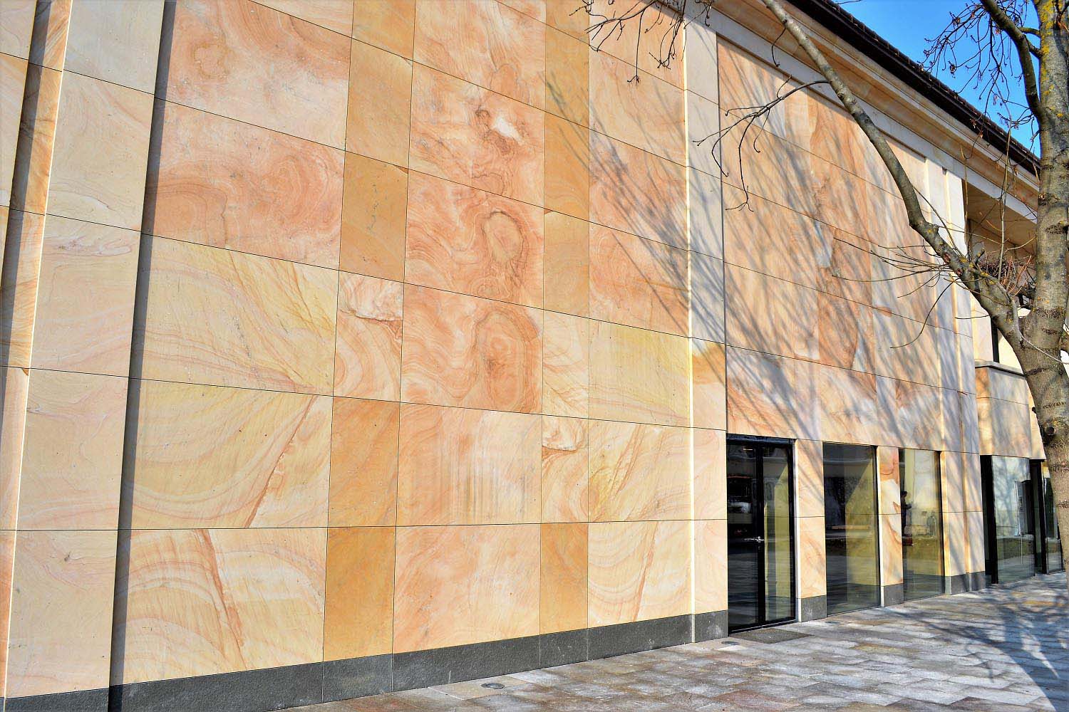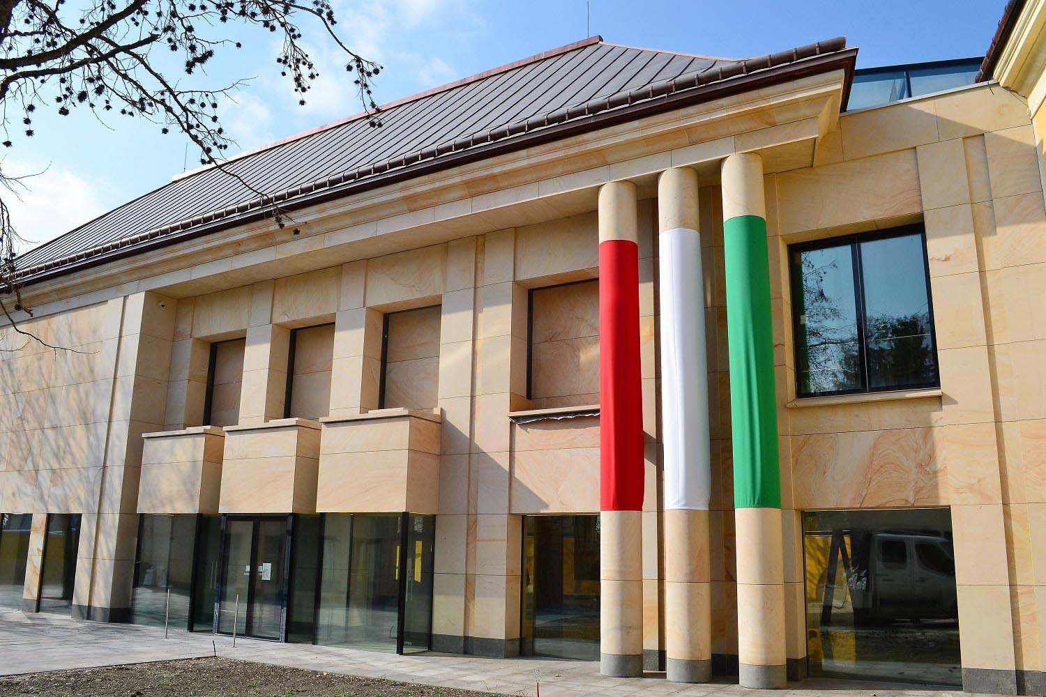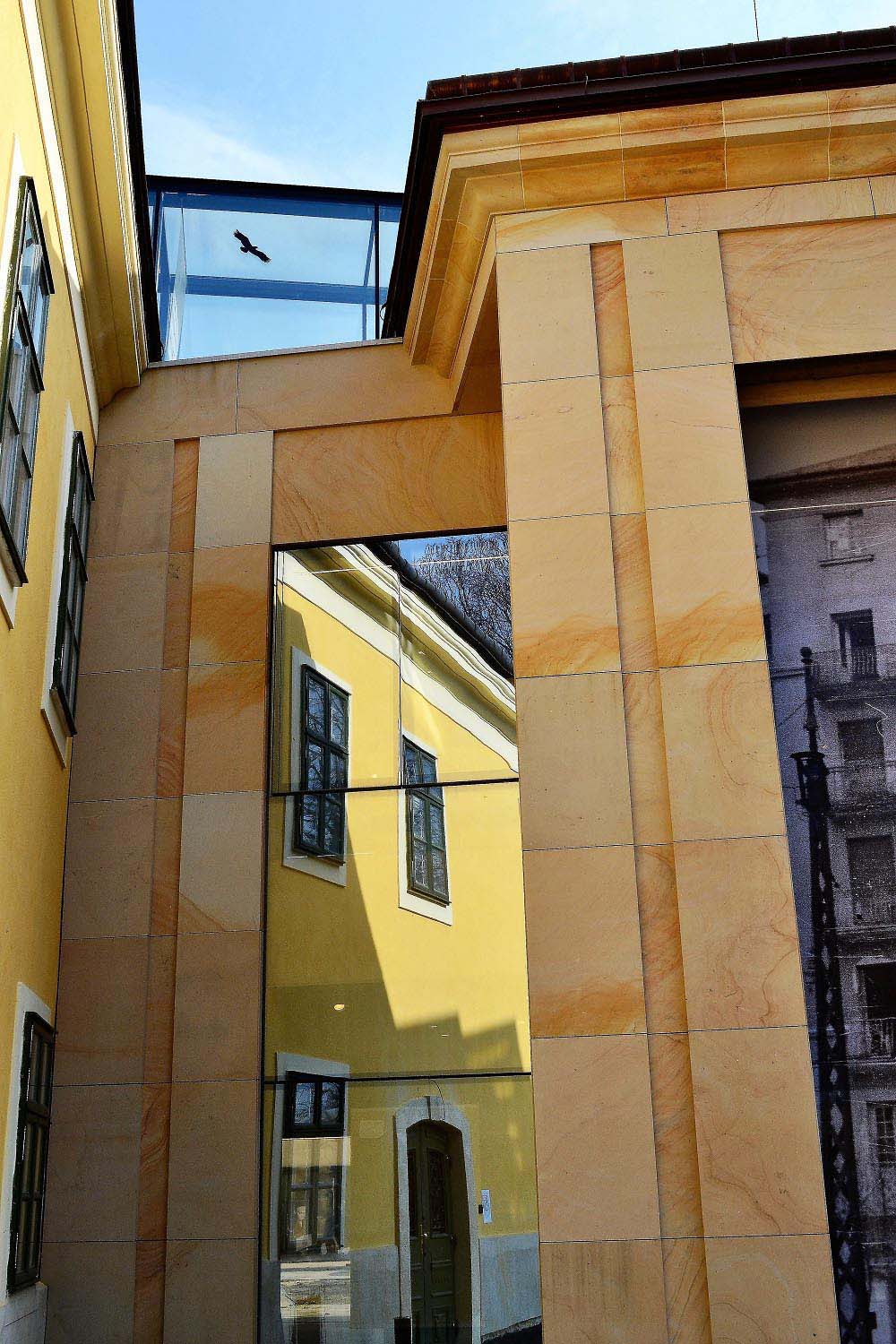 During the construction leaded by chief architect Márta Vörös, the facade of the new building were made of Crema Vateada spanish sandstone. The sandstone from Burgos, Spain, gives a unique character to the building: the yellow-beige-reddish shades do not hurt and fit to the yellow color of the adjacent building, but the pattern of the stone and the alternation of shades still give a unique look.