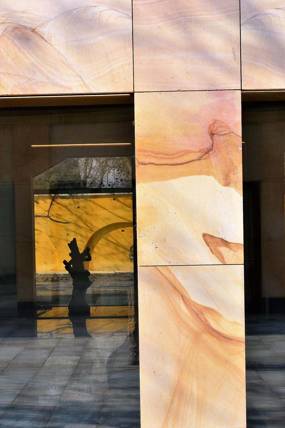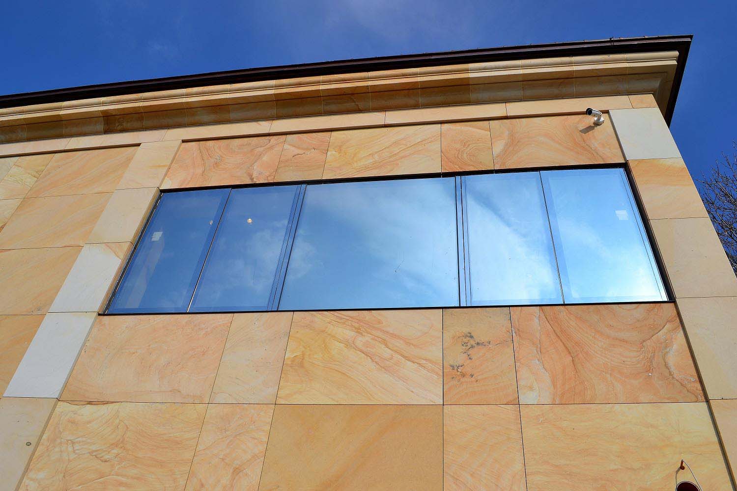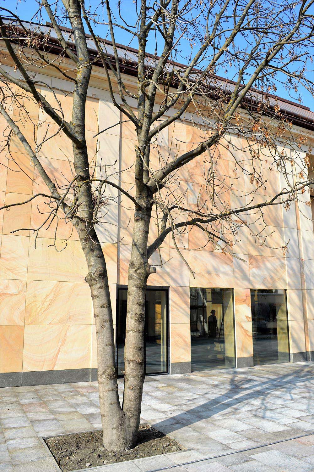 During the construction leaded by chief architect Márta Vörös, the facade of the new building were made of Crema Vateada spanish sandstone. The sandstone from Burgos, Spain, gives a unique character to the building: the yellow-beige-reddish shades do not hurt and fit to the yellow color of the adjacent building, but the pattern of the stone and the alternation of shades still give a unique look.